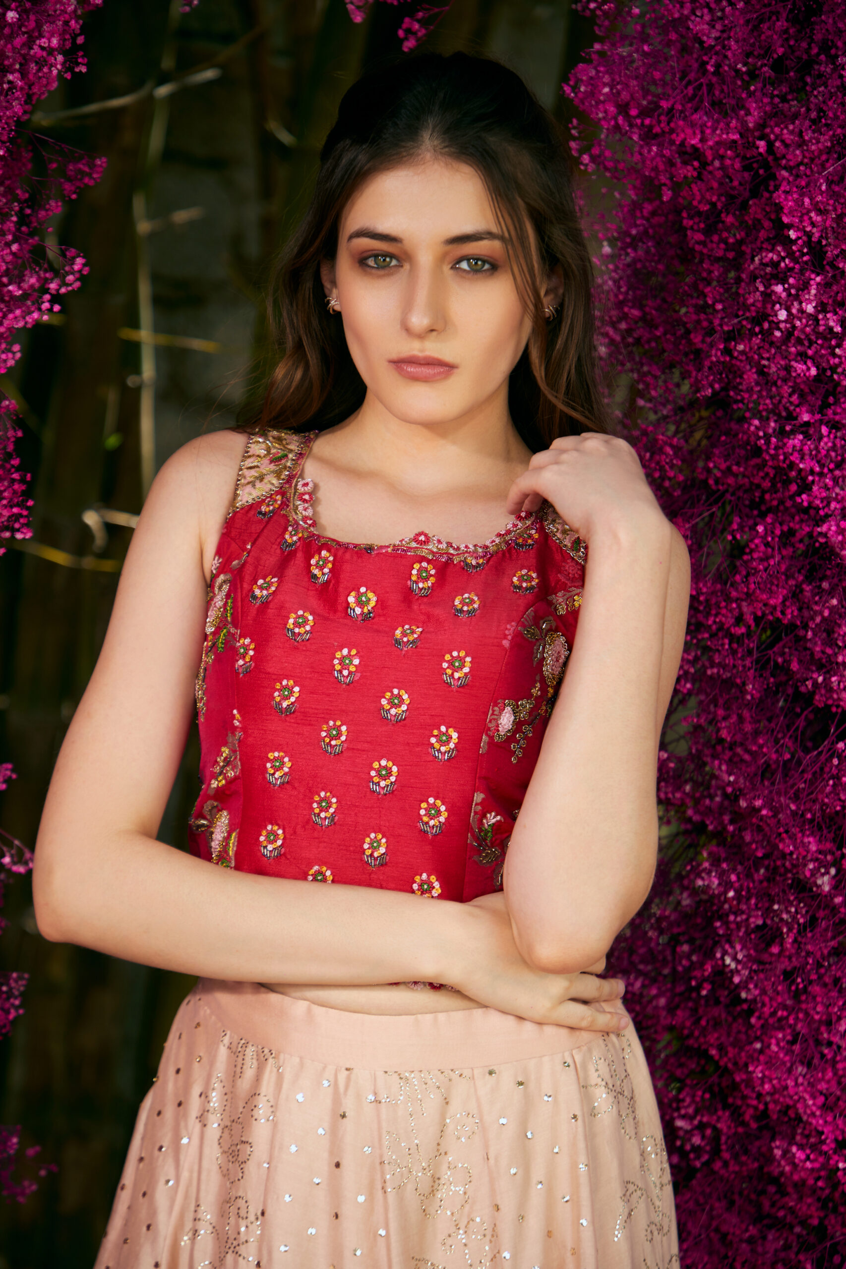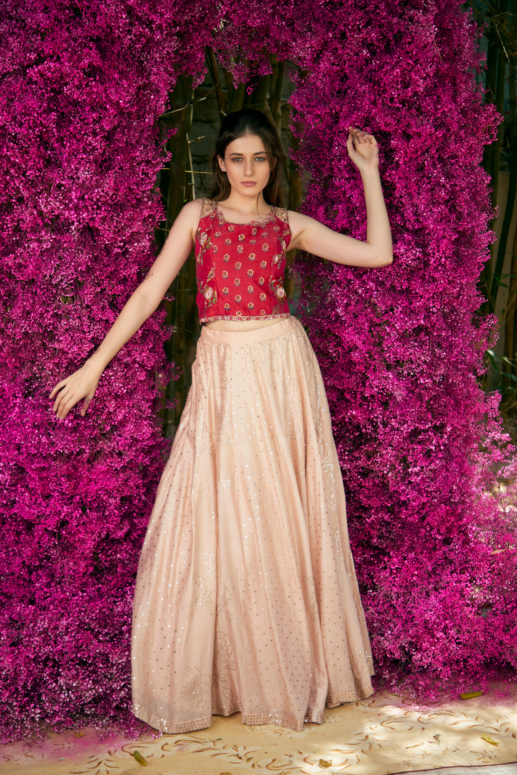 Chikankari pure soft chendari lehenga with raw silk hand embroidered corset top.