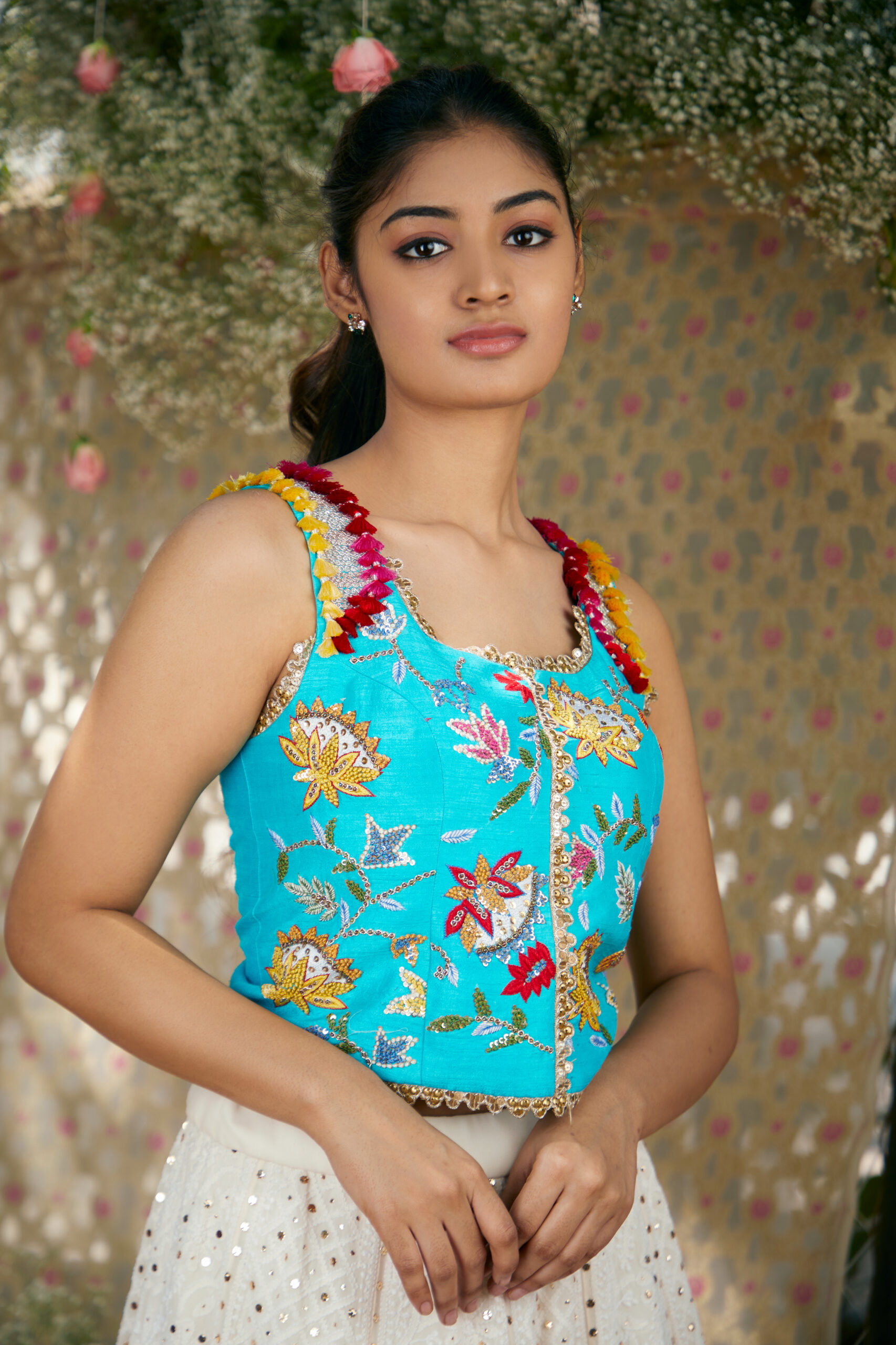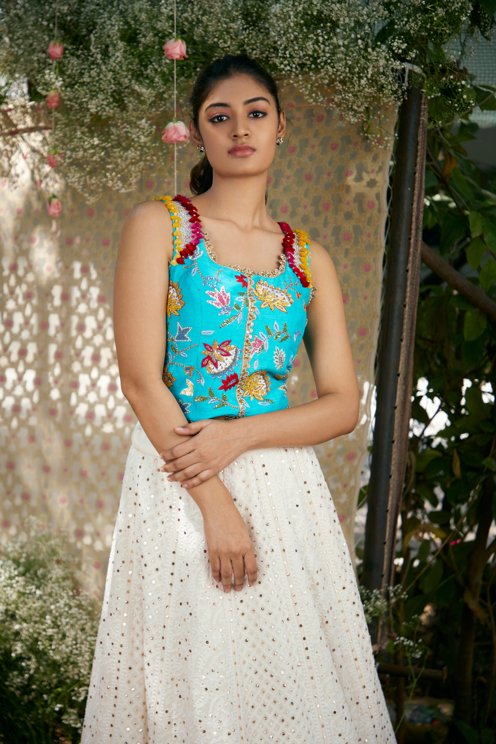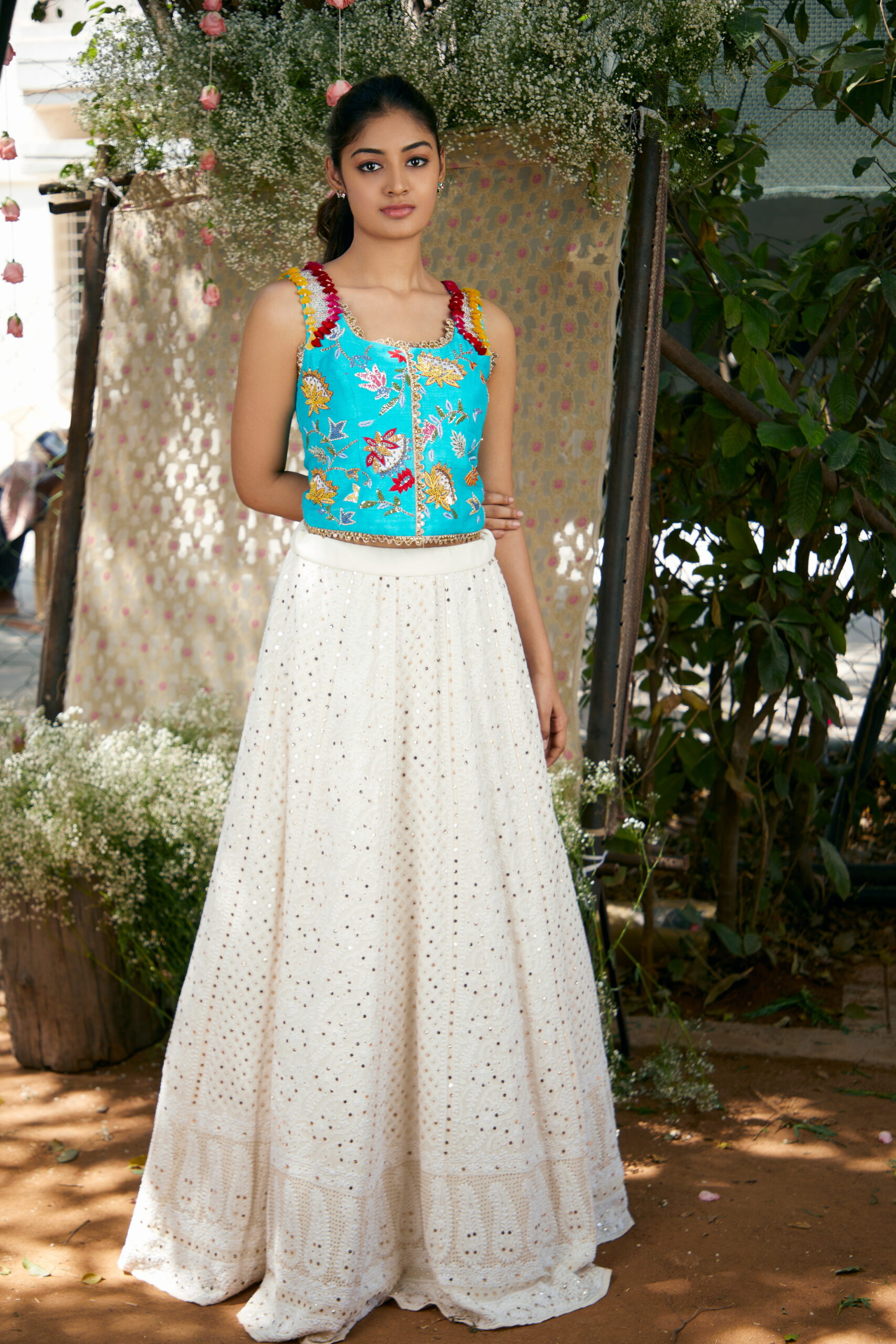 Color | Blue corset with multi colour hand embroidery with half white lehanga |