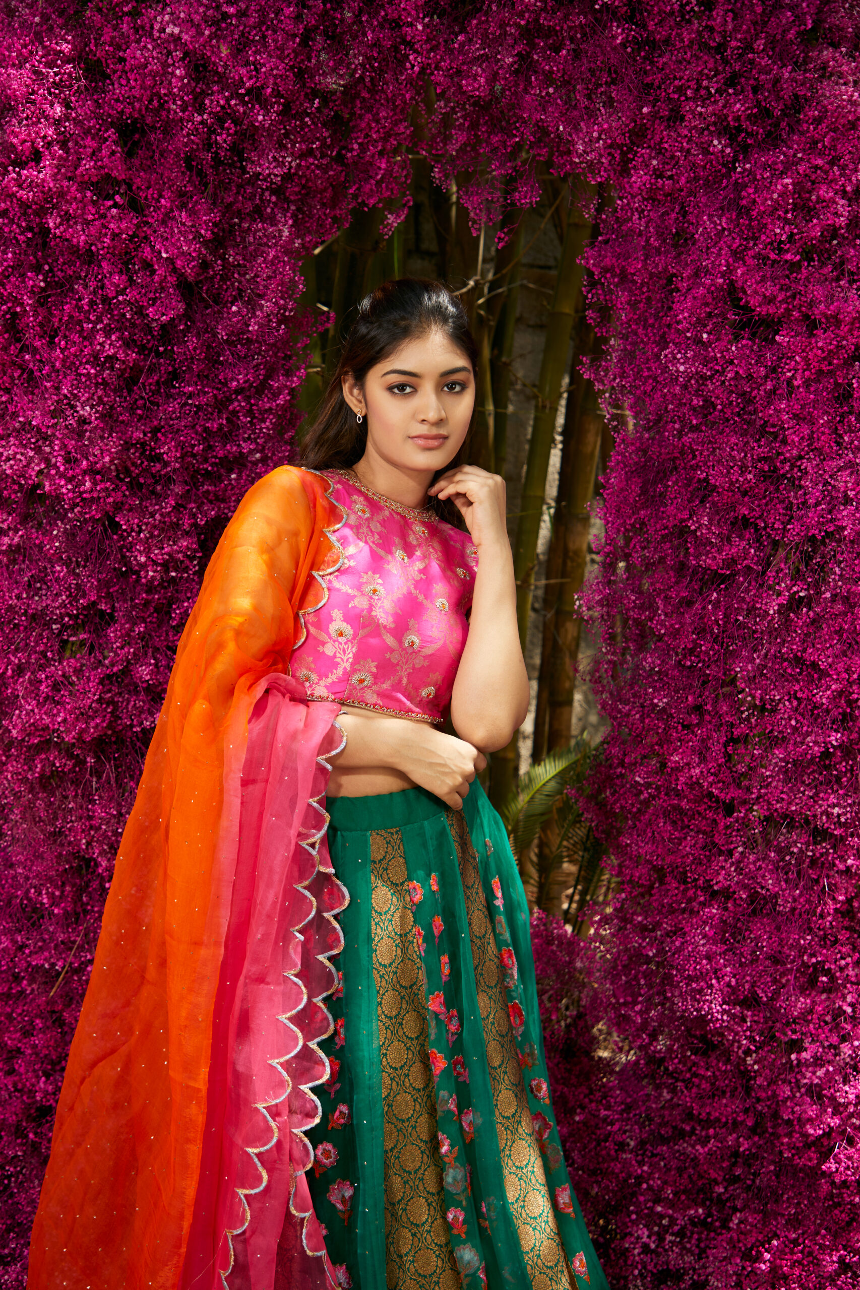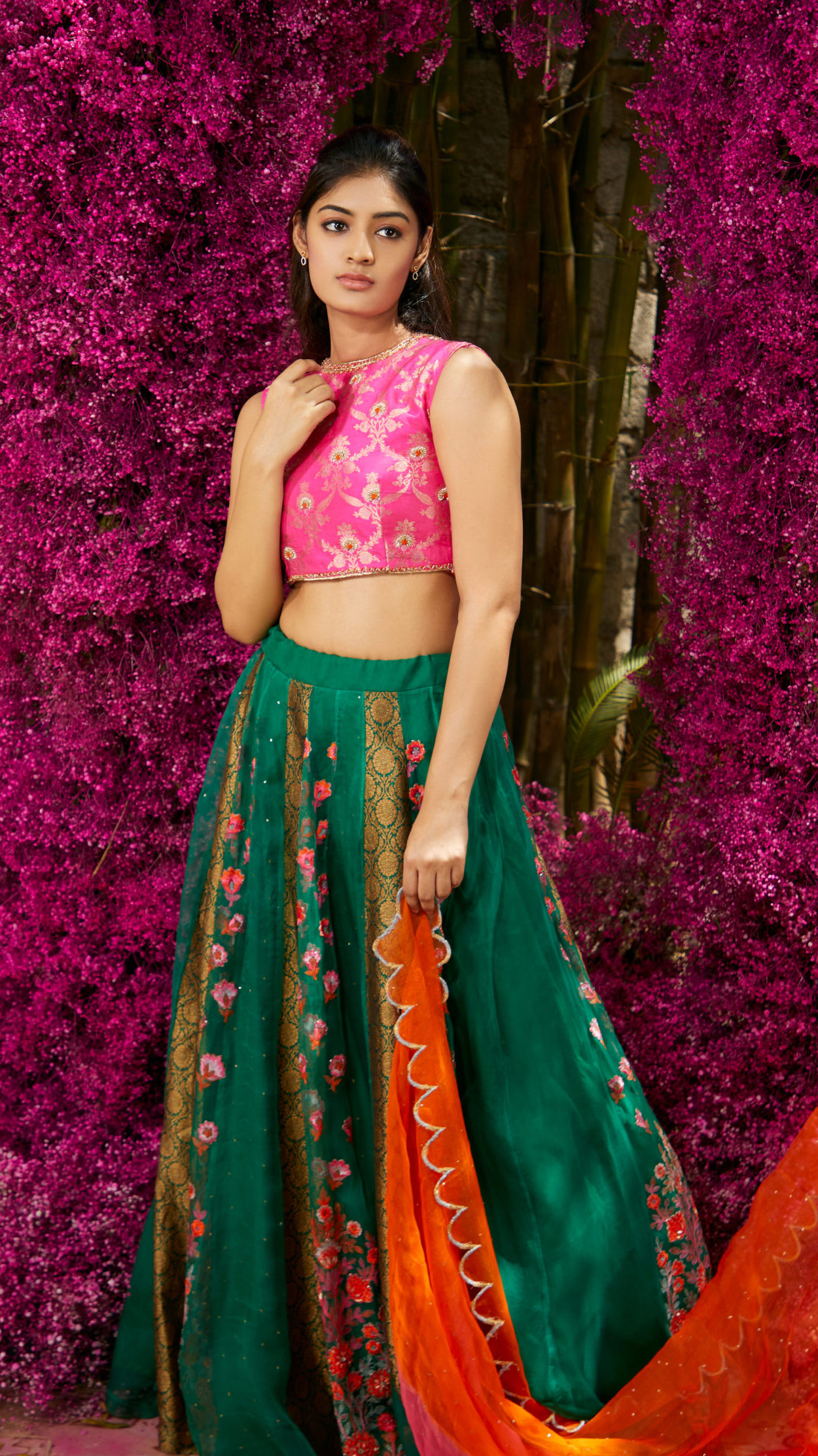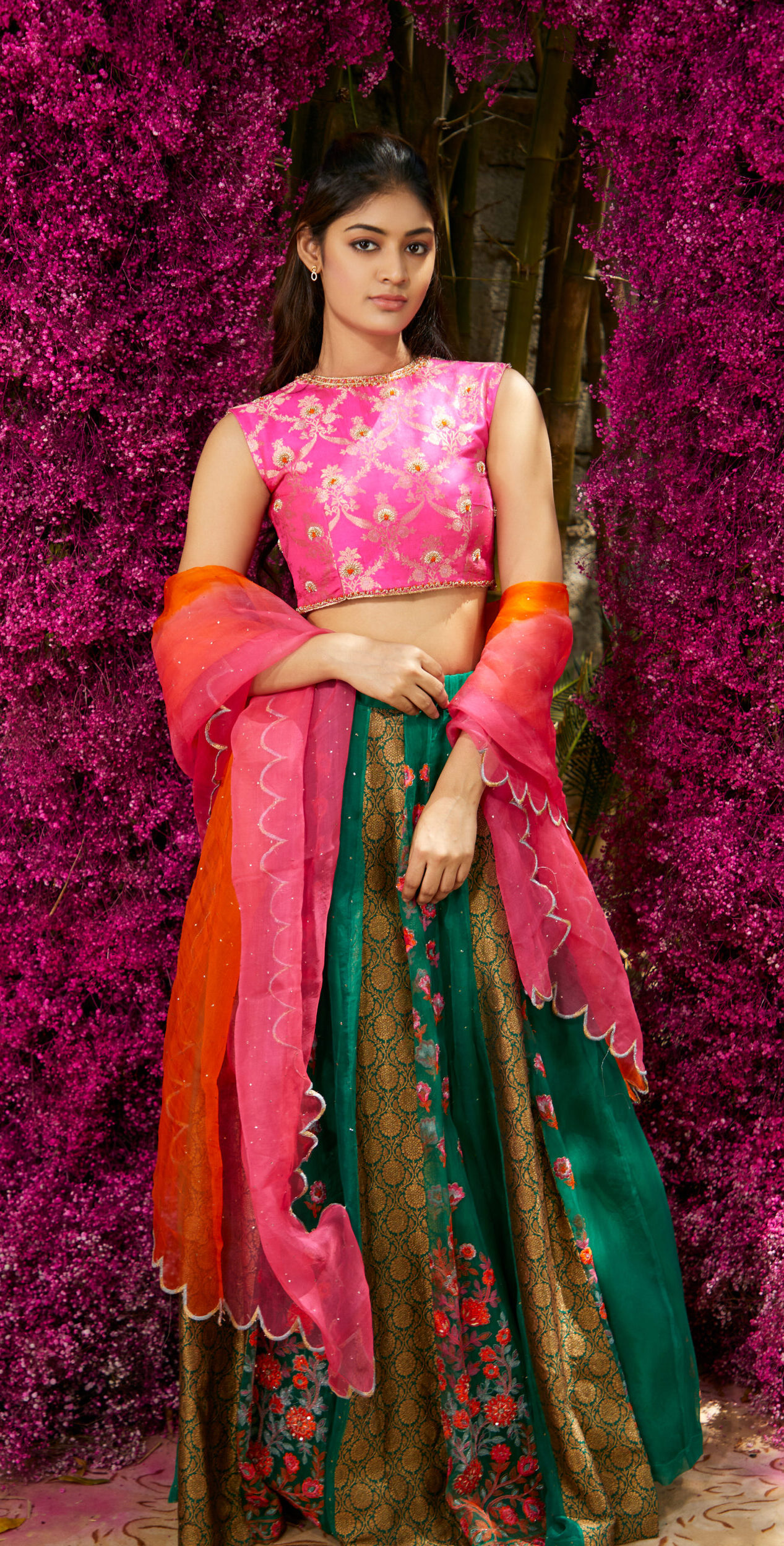 Orgenza and benarasi kalidar lehenga with embroidered blouse.