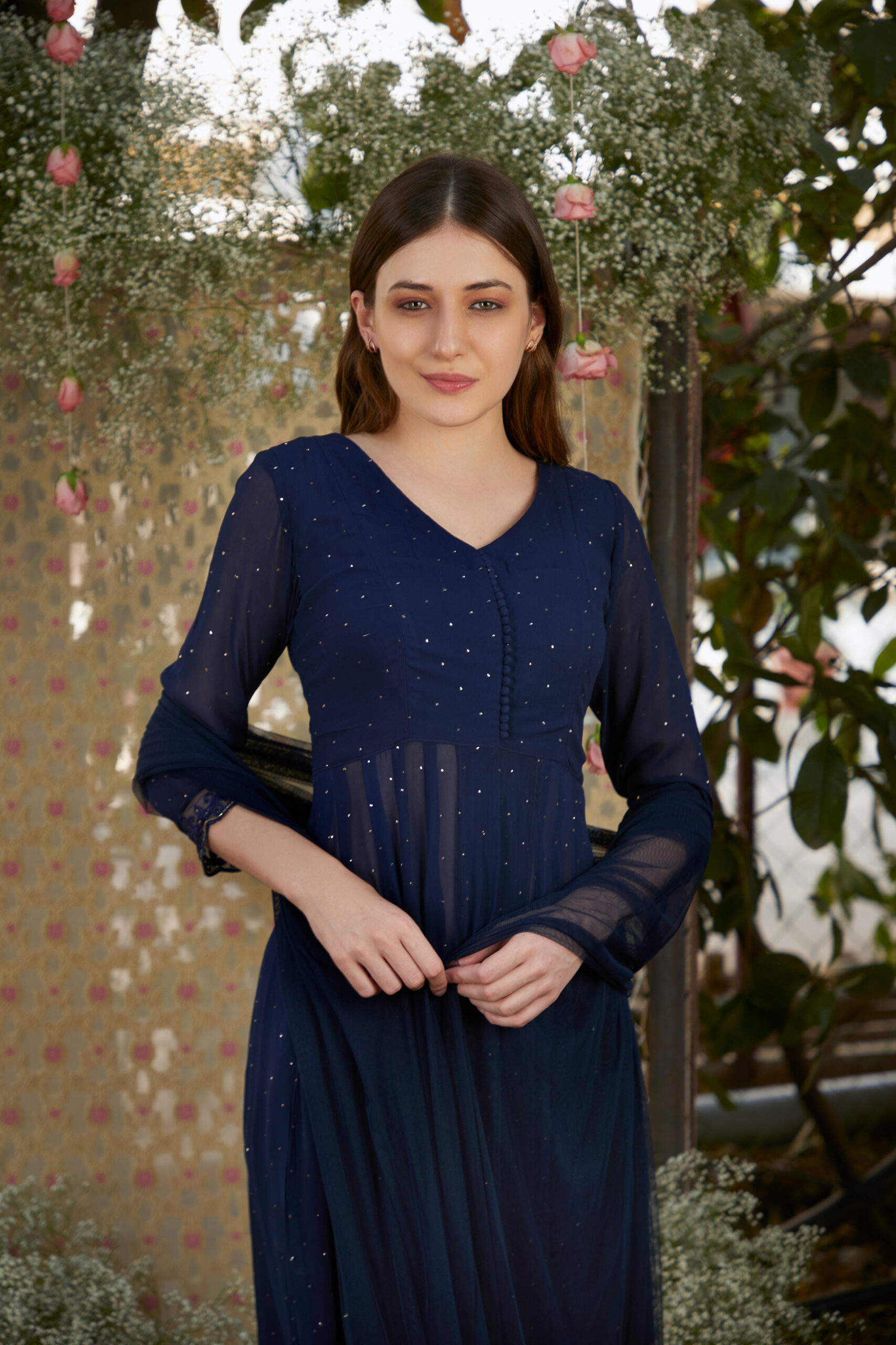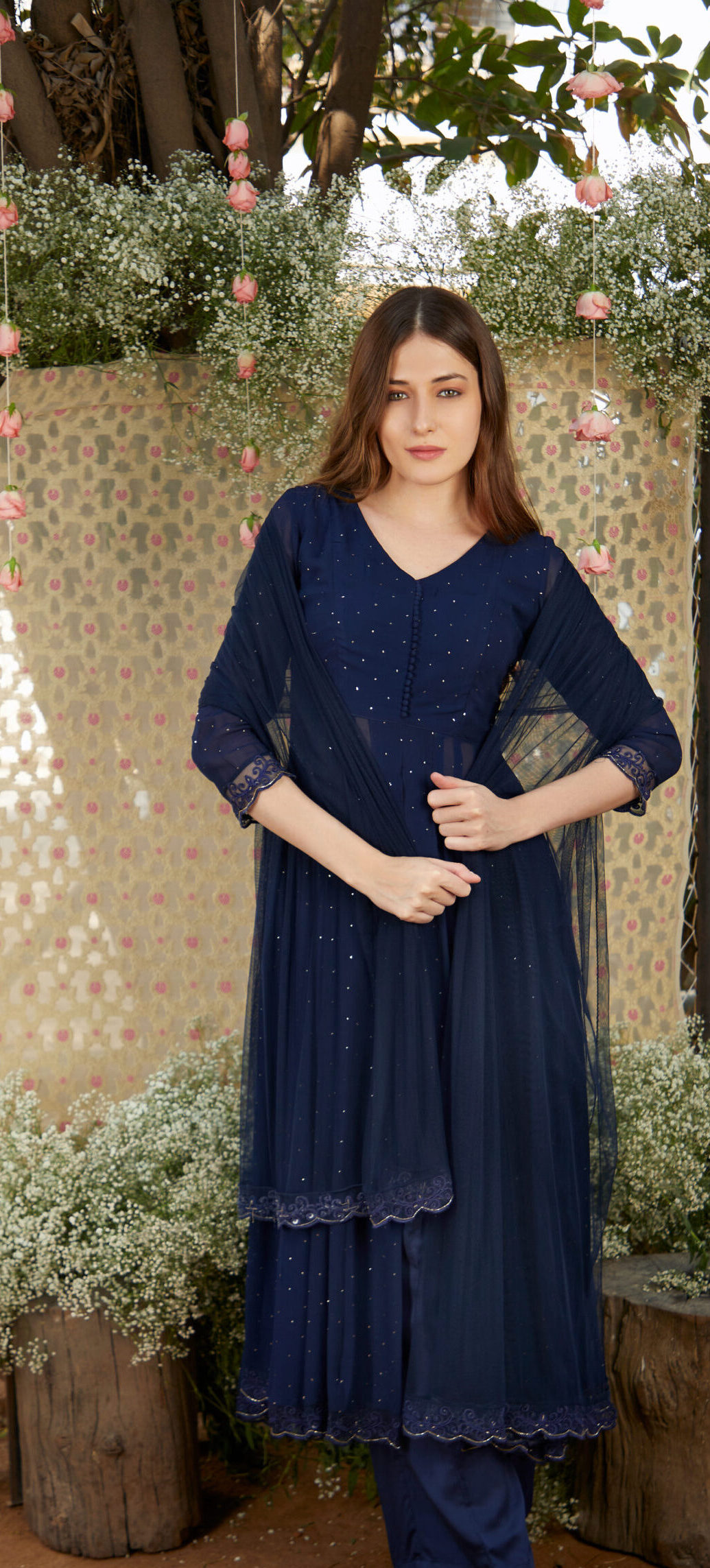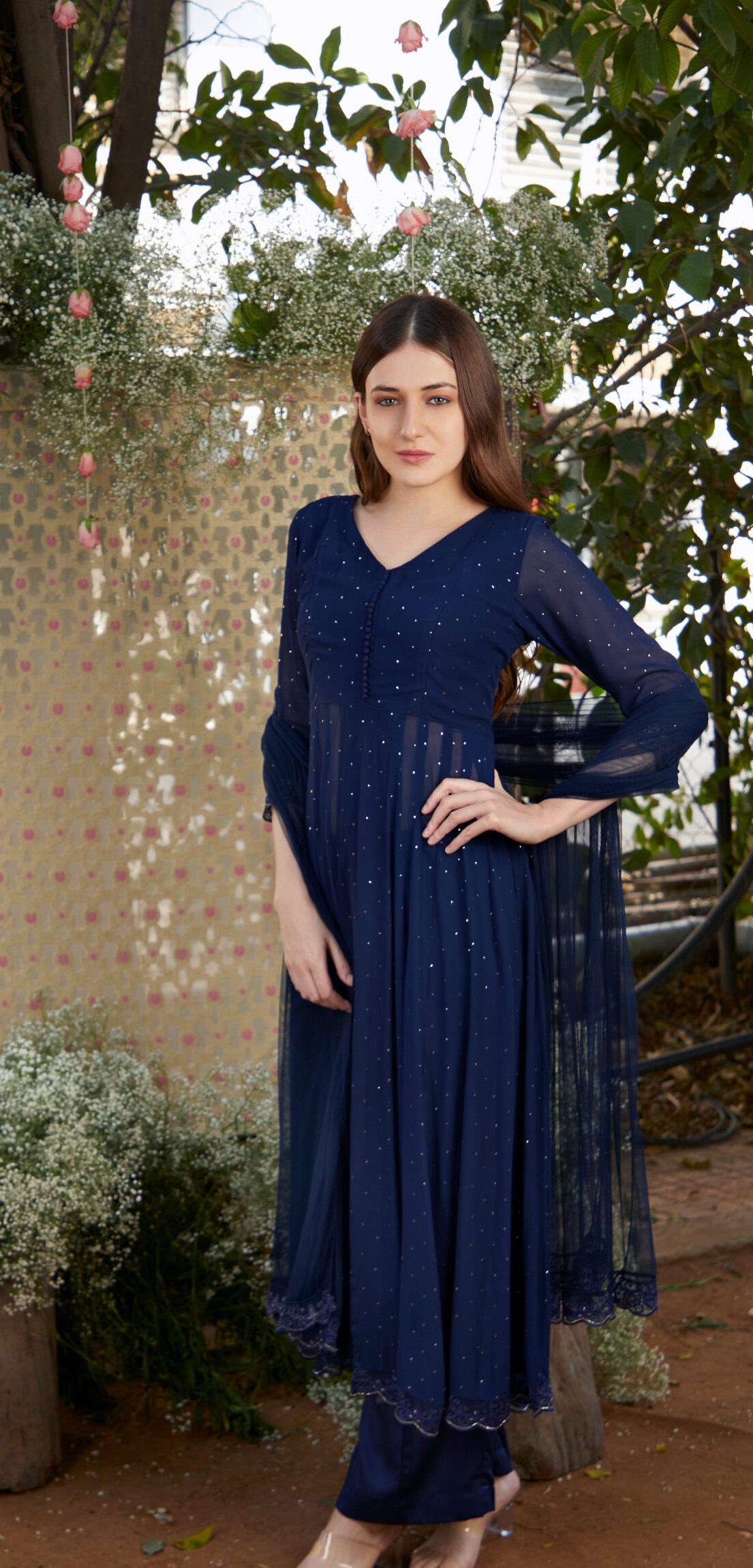 Pure georgette with all over Nikki work Anarkali set with beads hand work on dupatta boarder and hem line of kurtha.